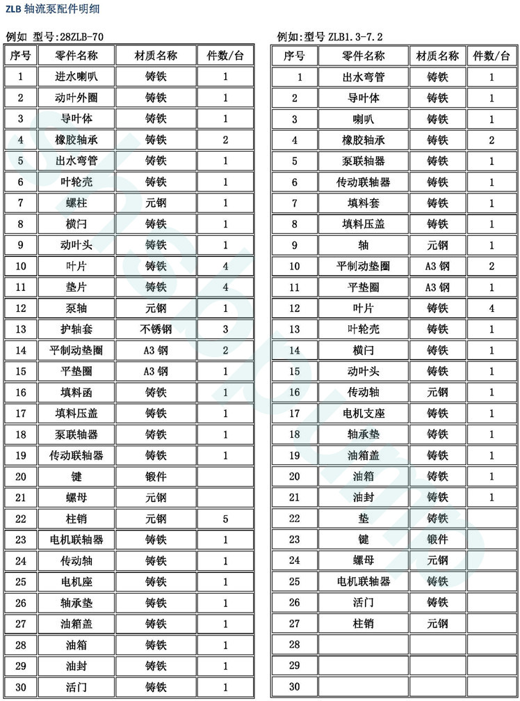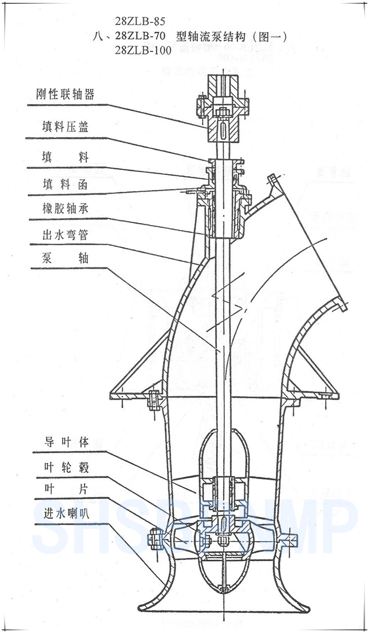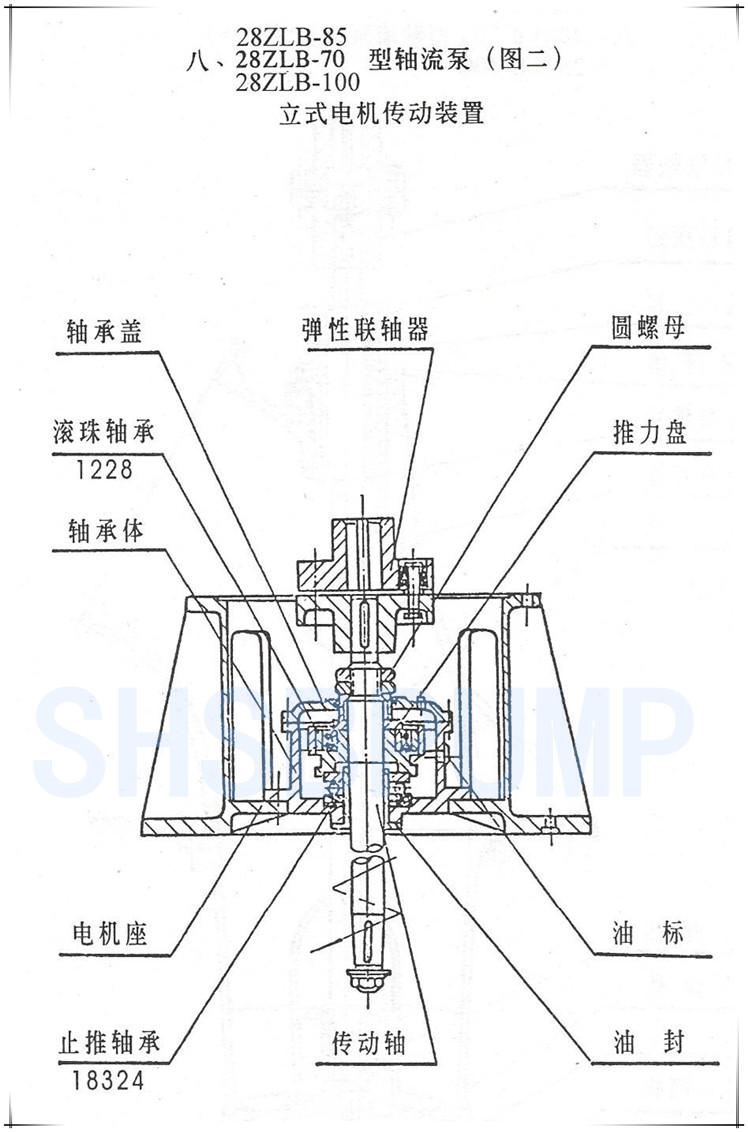 ZLB型泵均采用立式结构,配用立式电动机,图一、图二为轴流泵的结构及传动装置图