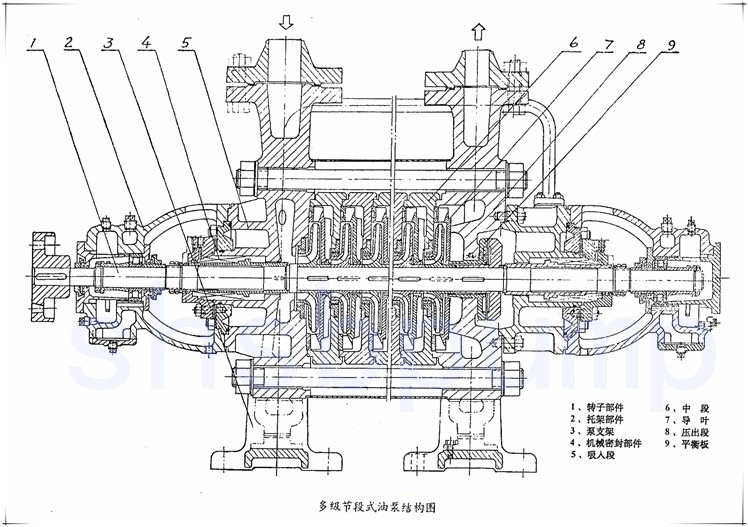 (1)壳体主要由吸入段、中段、压出段和导叶等组成,承受全部工作和由介质温度引起的热负荷;各段之间用穿杠螺栓固定。