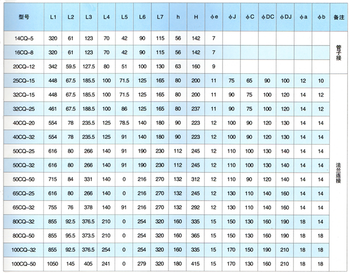 注:0.37KW以上均可配防爆电机,过流部件材质分别有304、304L、316/316L。 系统工作压力不大于0.6MPa,粘度不大于30×10﹣6m²/s,不含铁质和硬固体颗粒液体的输送。 |