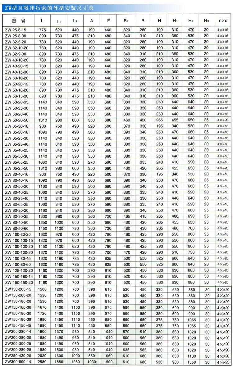 ZW型自吸式无堵塞排污泵性能参数
