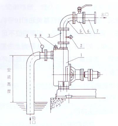 1.泵 2.压力表 3.出口垂管 4.吸入硬喉管 5.弯头 6.流量控制阀 7.出口管路 8.加液螺塞 9.真空表