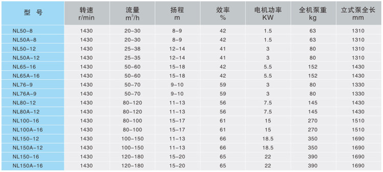 NL泥浆泵系单级单吸立式离心泵,主要部件有蜗壳、叶轮、泵座、泵壳、支撑筒、电机座、电动机等组成。蜗壳、泵座、电机座、叶轮螺母是生铁铸造、耐腐性、耐腐蚀性较好,加工工艺方便。