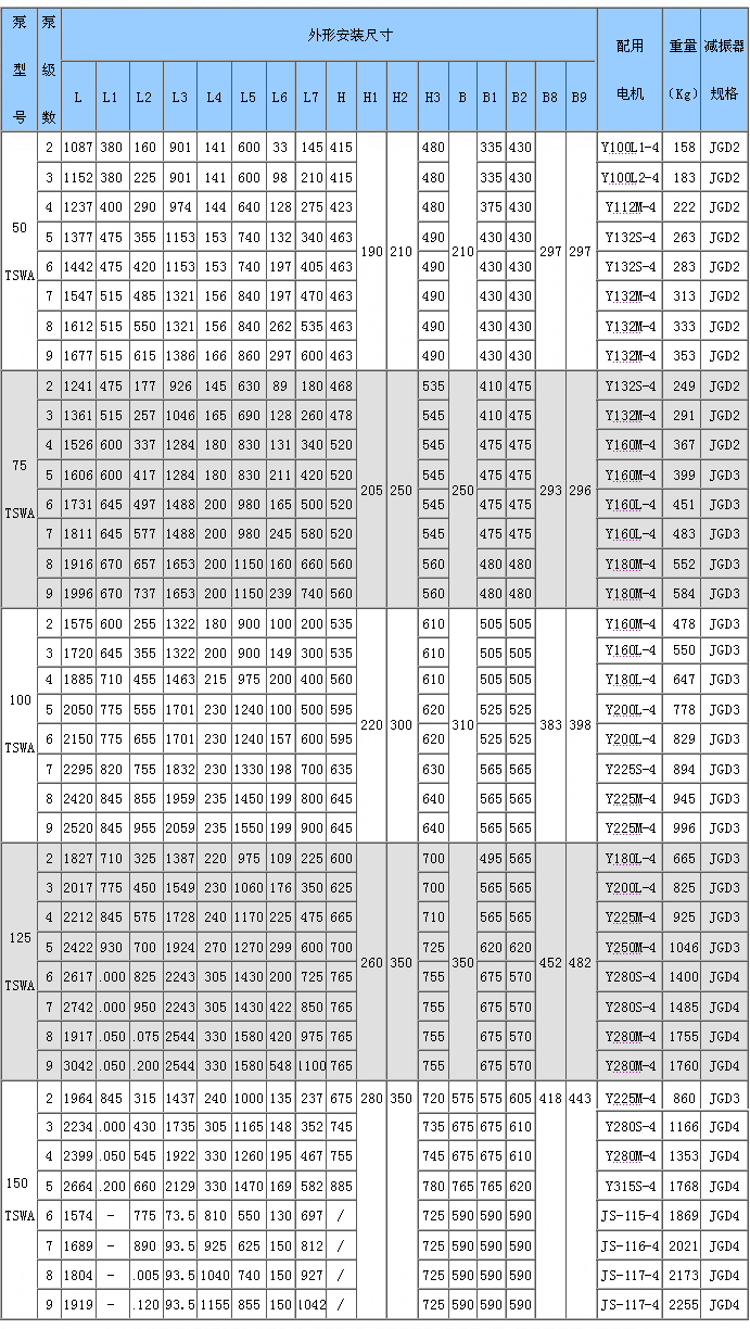 TSWA型卧式多级离心泵外形安装尺寸表