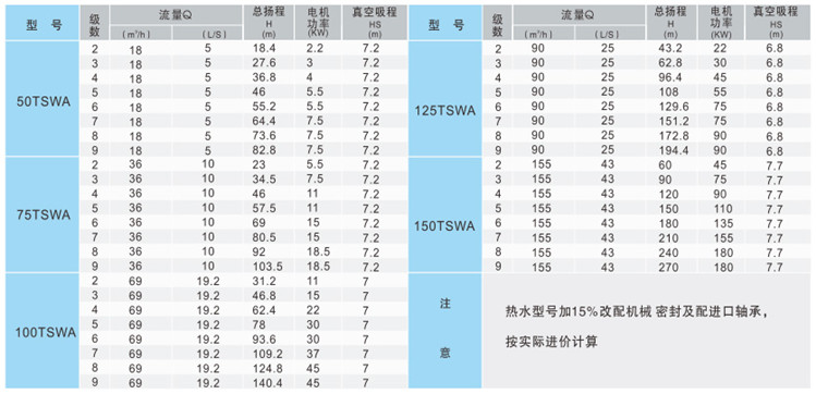 1、TSWA卧式多级泵为多级节段式结构,其吸入口为水平方向,吐出口为垂直向上布置,设有50、75、100、125、150等口径,用户根据流量、扬程的需求选择不同品径和级数的泵来得到满足;
