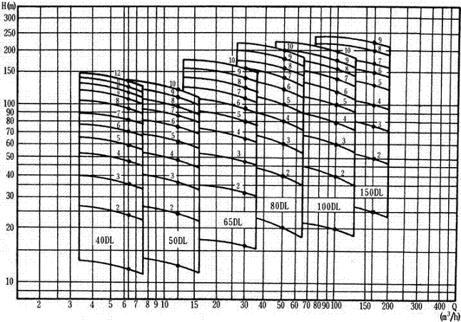 4、根据实际情况,DL型立式多级离心泵的出口可装配成1~5个出口,以满足同一台泵上获得不同的扬程;