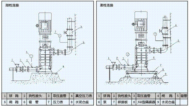 3.泵与底座安装有两种方式,一种是直接装在水泥基础上的刚性连接,另一种是采用JGD型减振器安装的柔性连接,具体方法见安装示意图所示。