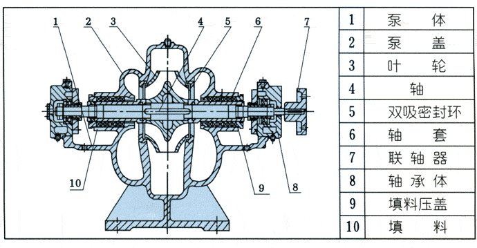 6. 运行平稳 优化设计的双吸叶轮使轴向力减小到最低限度,且有优异水力性能的叶型,离心泵泵壳内表面及叶轮表面具有抗汽蚀性能。