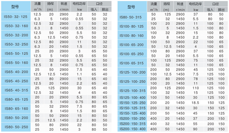 IS、IR(热水型)型单级离心泵,它是BA型、BL型及其他单级清水离心泵的更新型。优点有:全系列水力性能布局合理,用户选择范围宽,检修方便;本型泵适用于工业和城市给水、排水,也可用于农业排灌及供输送清水或物理化学性质类似于清水的其他液体之用,温度不高80℃。
