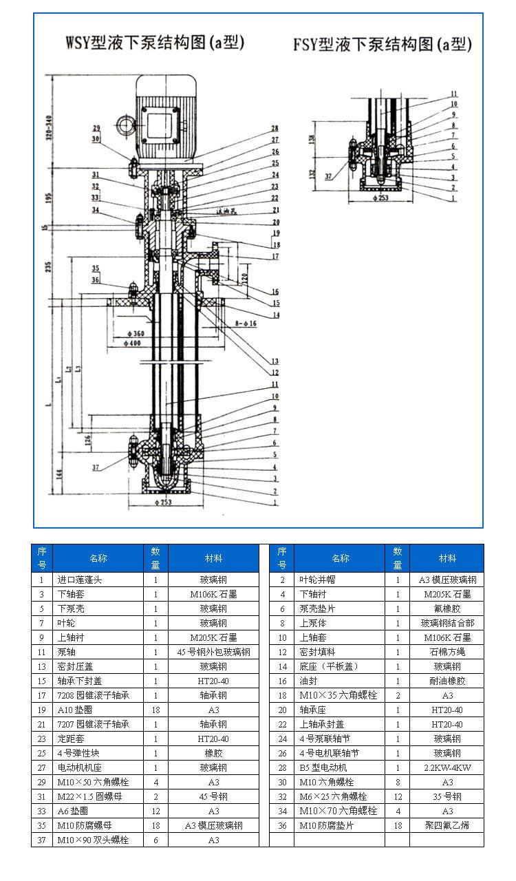 本单位生产的WSY型、FSY型两种型式的泵,1.WSY型泵为立式玻璃钢液下旋涡泵。2.FSY型泵为立式玻璃钢液下离心泵,该泵因伸入贮罐,贮槽的深度长短不同,设计液下深度800mm--3000mm之间任意选择。只要液体高于泵体,即可不灌液而起动送液,平盖板下设有泄漏孔,液体不会向贮罐外泄漏。