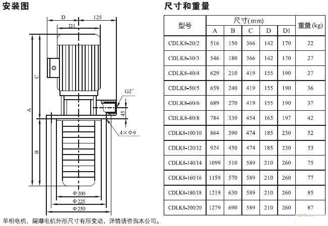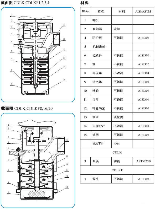 CDLK/CDLKF为安装标准电机的百自吸立式多级离心泵,电机轴通过泵头用联轴器直接与泵轴联接,泵可根据需要配置智能保护器,对泵干转、缺相、过载等进行有效保护。为满足水槽或容器的安装深度,可安装空腔体来改变泵本身的长度,不同的级数长度见尺寸和重量表和可供产品范围表。