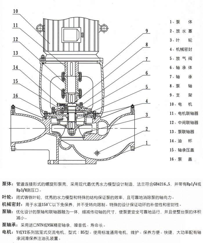 1 泵体 2 放水塞 3 叶轮 4 机械密封 5 放气阀 6 轴承体 7 轴承 8 泵轴 9 支架 10 电机 11 电机联轴器 12 中间联轴器 13 泵联轴器 14 油杯 15 轴承压盖 16 泵盖