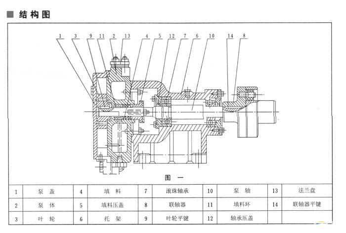 由铸铁制成叶轮(3),有12个叶片呈放射状均分布,有平衡孔(其中两个套扣供拆卸用)平衡轴向力。叶轮平键(9)与轴(10)联接并可沿轴向滑动调节间隙。轴为优质钢制成.支承在泵的托架(6)内的两个滚珠轴承(17)上右端有弹性联轴器(8)和电机直接联接。托架(6)用铸铁制成.有止口保证与泵体准确联接,轴承间有空腔,可存润滑油,用稀油或齿油滑均可。