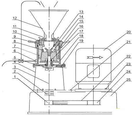 9.手柄10.压盖 11.活接 12.加料斗 13.旋叶刀 14.动磨盘 15.静磨盘 16.调节盘